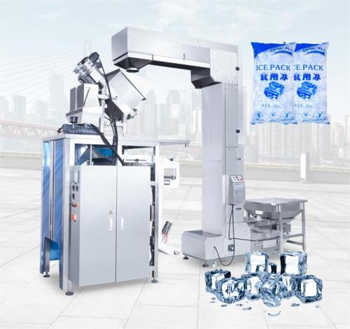 Fully automatic 10kg ice cube tube ice packaging machine. In the video, this set of equipment is mainly composed of a special ice cube loading machine + a special turntable metering device for packaging ice cubes + a 780 tilt packaging machine host. The granular ice cubes are lifted to the turntable metering device through the loading machine. The metering device performs automatic quantitative unloading and packaging. The main engine of the packaging machine simultaneously starts bag making, coding and filling, and packaging sealing and cutting. A series of actions are completed in one go.